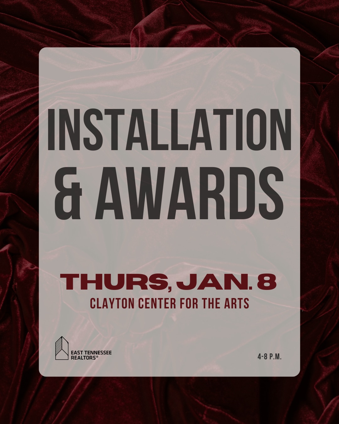 Join us for the East Tennessee REALTORS® Annual Installation & Awards Celebration, an occasion dedicated to celebrating our successes and looking ahead to the future! This is a special opportunity to honor the remarkable achievements of our members and install our new leadership team. Prepare for an evening of inspiration, recognition, and networking as we come together to celebrate the hard work and accomplishments that define our Realtor® community. We will be hosting both the installation and awards ceremony and a reception to follow in the foyer of the Clayton Center for the Arts (502 East Lamar Alexander Parkway, Maryville 37804) featuring drinks and heavy hors d'oeuvres to celebrate the achievements of 2025 and the excitement for 2026! It’s a date you won't want to miss, filled with uplifting moments and the chance to connect with fellow REALTORS®.